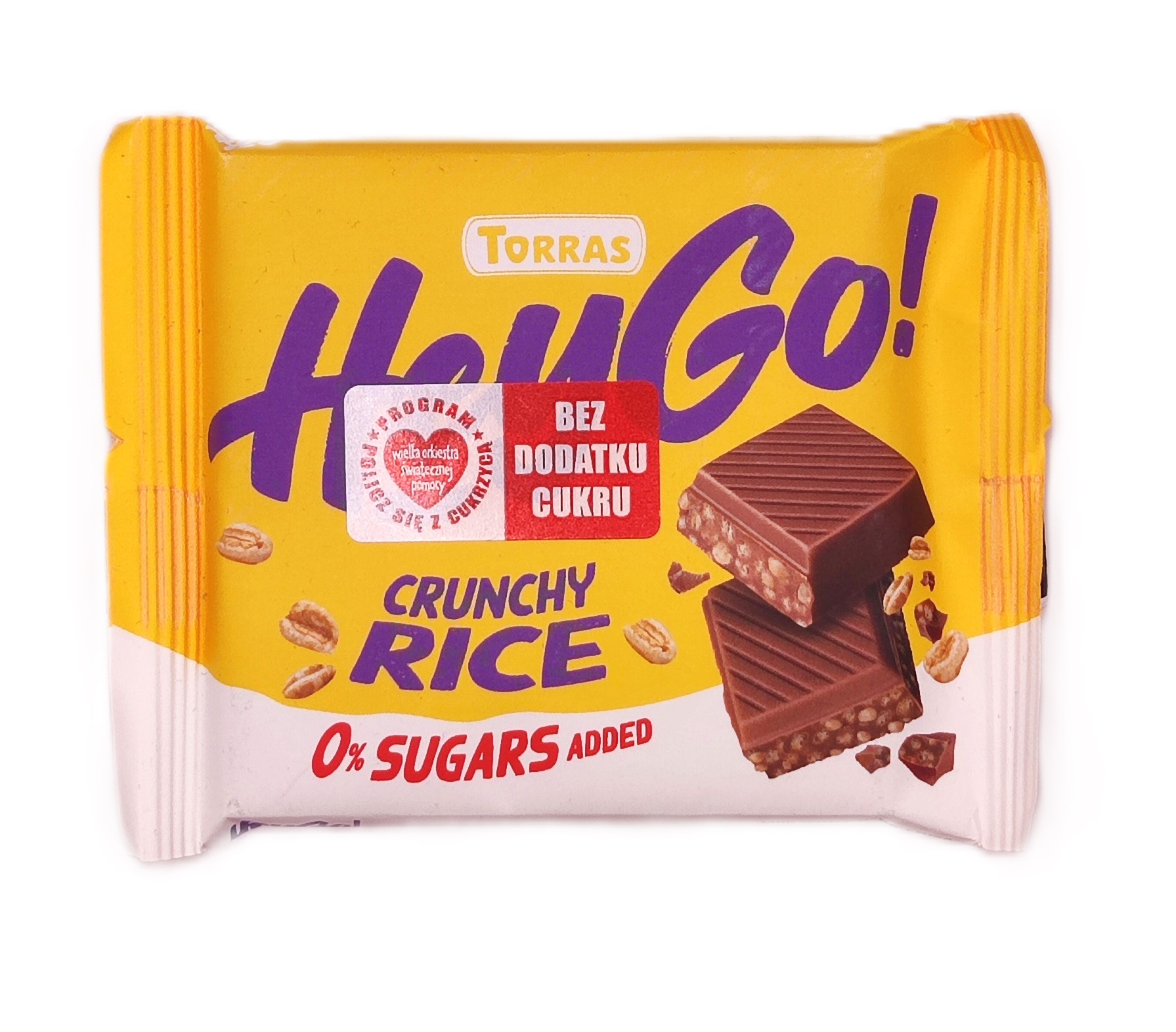 Smaczna i chrupiąca czekolada Torras HeyGo! z dodatkiem ryżu preparowanego. Produkt bez dodatku cukru, odpowiedni dla osób kontrolujących poziom glukozy. Substancje słodzące zachowują słodycz, a chrupiący ryż dodaje przyjemnej tekstury.